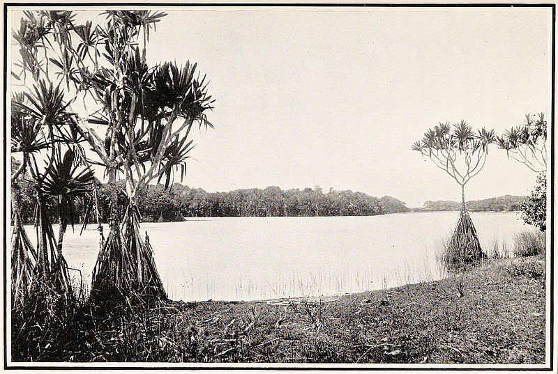 Our fourth (and last) day of canoe voyaging was begun soon after six o’clock. Outrigger canoes made their appearance, a style of craft the Hovas seem never to have invented, nor are such in use on the east coast. The scenery increased in boldness, with precipitous hillsides rising from the side of the river, which here was about the size of the Thames at Kew. About an hour after leaving, we found the current running up the stream; it was feeling the influence of the tide from the ocean, still many miles distant. The foliage was most dense and luxuriant, from the summit of the hills down to the water’s edge, in some parts the long lianas forming immense festoons and making a perfect wall of exquisite green, while the ever-present bàraràta shoots up its feathery head. After some time we turned from the main stream into a branch river, much narrower, but running for many miles in a straight line. As the day advanced, the intense sunlight made everything glow with light and heat, lighting up the dense vegetation most brilliantly. Groups of pandanus were frequent here among the more European-like trees; these are of two species, one rising into a lofty cone, almost like a low poplar, and the other one more spreading and brandishing, with the aerial roots rising high above the ground. After an hour or two we came again into the main stream, here more than a mile wide, the banks being still thickly wooded. It was intensely hot, and we were not sorry to see Màrovoày (“Many crocodiles”) a few miles ahead of us on a detached hill to the east of the river.