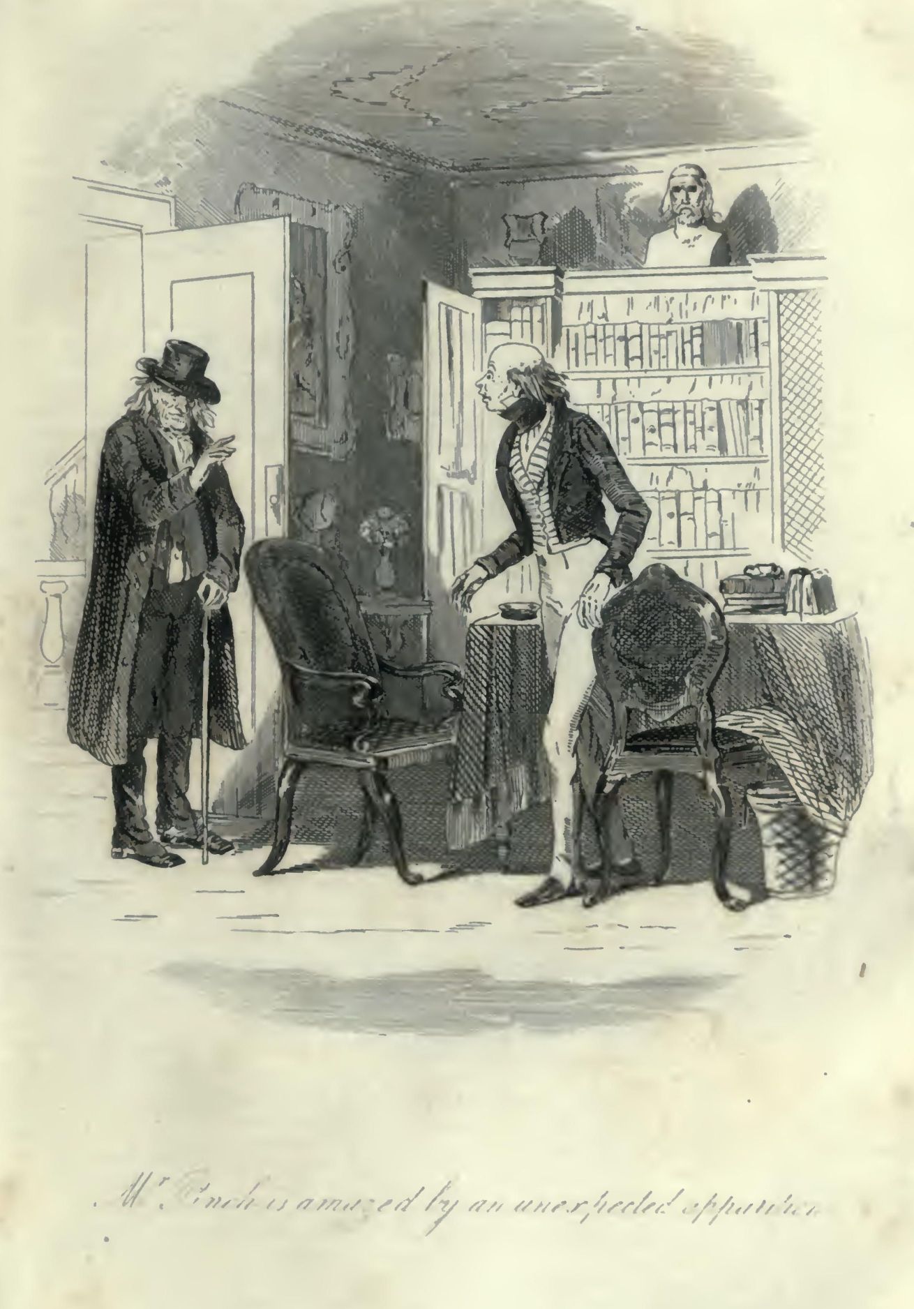 It has been said that there is no instance, in modern times, of a Chuzzlewit having been found on terms of intimacy with the Great. But here again the sneering detractors who weave such miserable figments from their malicious brains, are stricken dumb by evidence. For letters are yet in the possession of various branches of the family, from which it distinctly appears, being stated in so many words, that one Diggory Chuzzlewit was in the habit of perpetually dining with Duke Humphrey. So constantly was he a guest at that nobleman’s table, indeed; and so unceasingly were His Grace’s hospitality and companionship forced, as it were, upon him; that we find him uneasy, and full of constraint and reluctance; writing his friends to the effect that if they fail to do so and so by bearer, he will have no choice but to dine again with Duke Humphrey; and expressing himself in a very marked and extraordinary manner as one surfeited of High Life and Gracious Company.