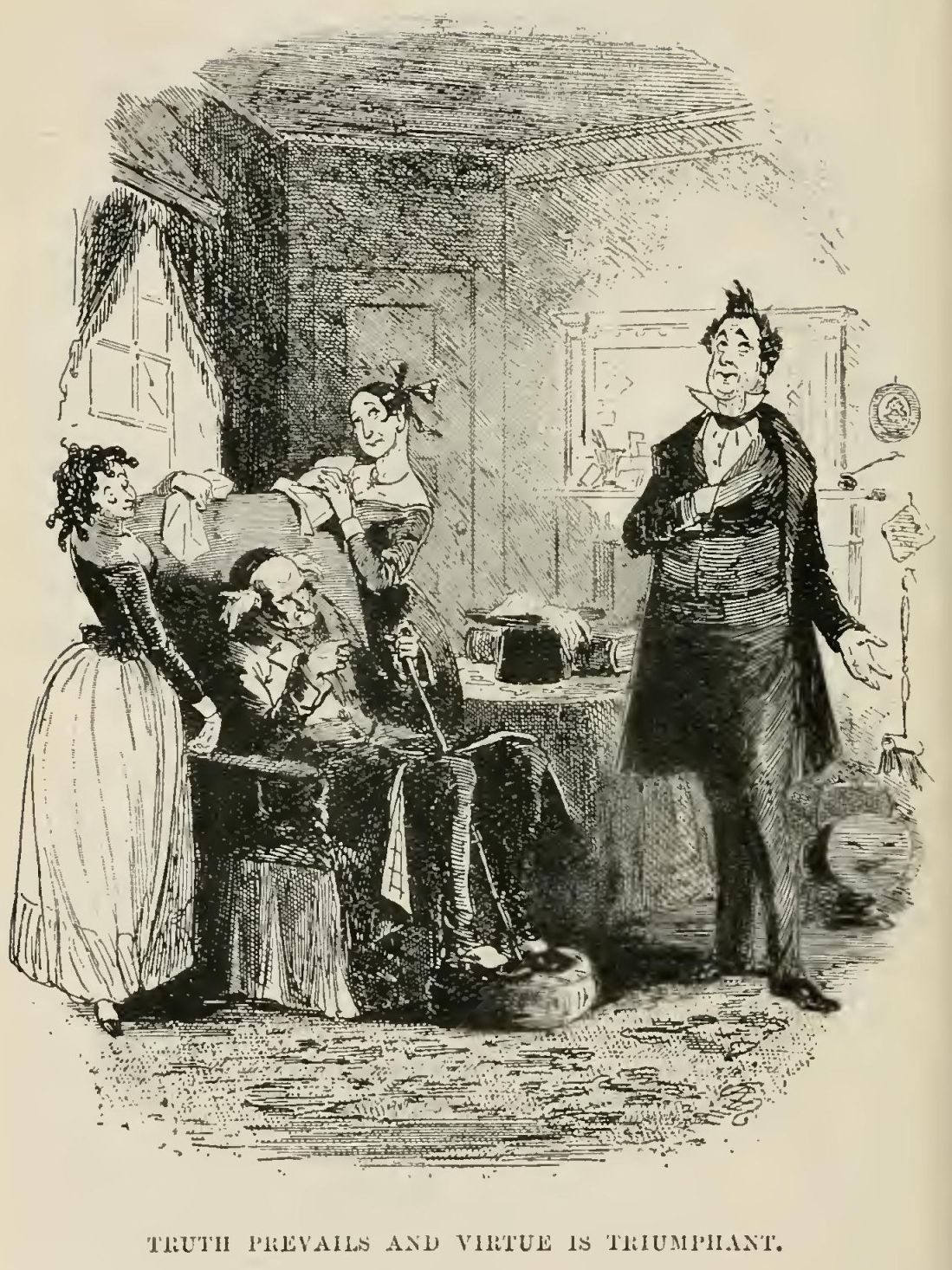 ‘Tut, tut,’ said Mr Pecksniff, pushing his latest-born away and running his fingers through his hair, as he resumed his tranquil face. ‘What folly is this! Let us take heed how we laugh without reason lest we cry with it. What is the domestic news since yesterday? John Westlock is gone, I hope?’