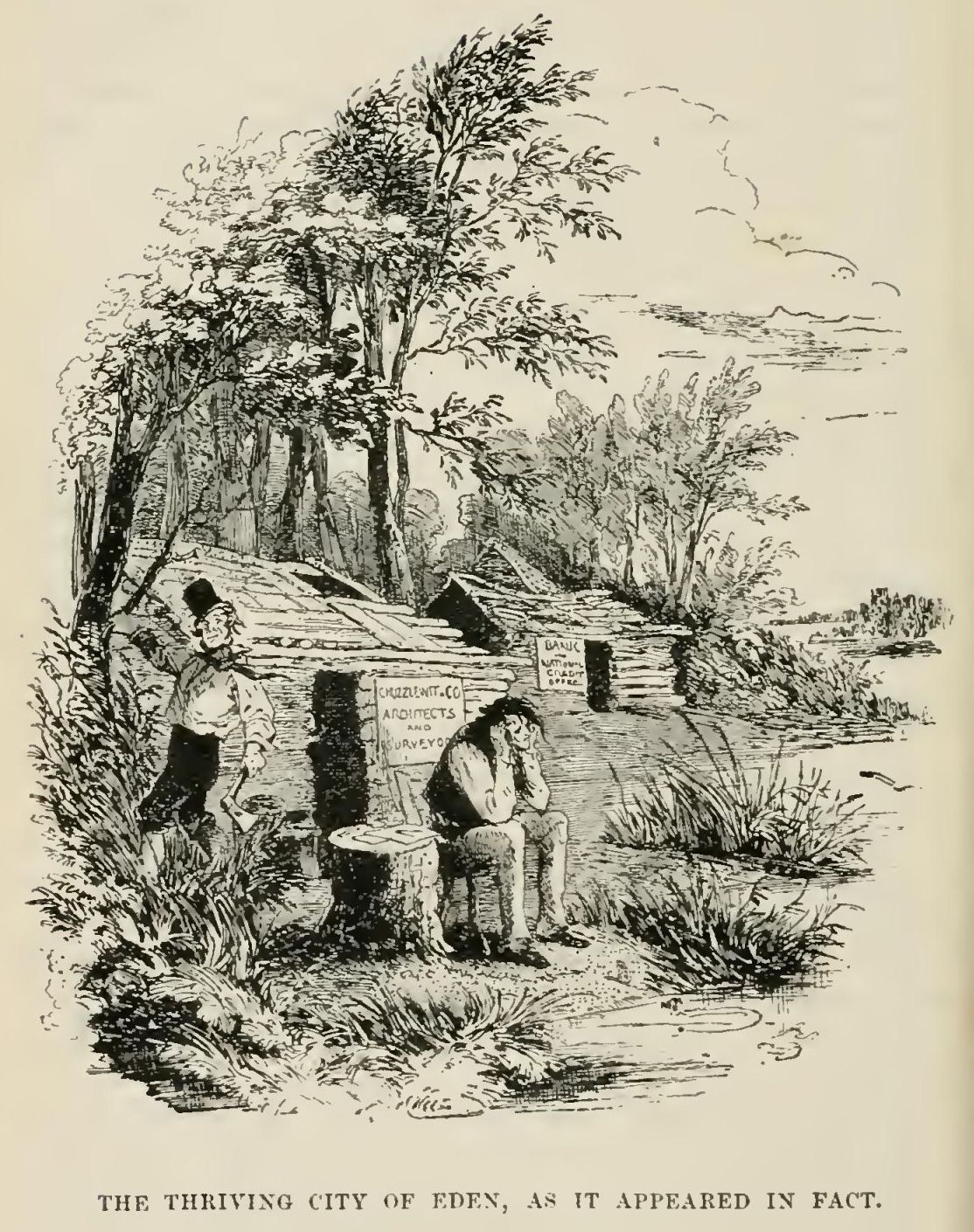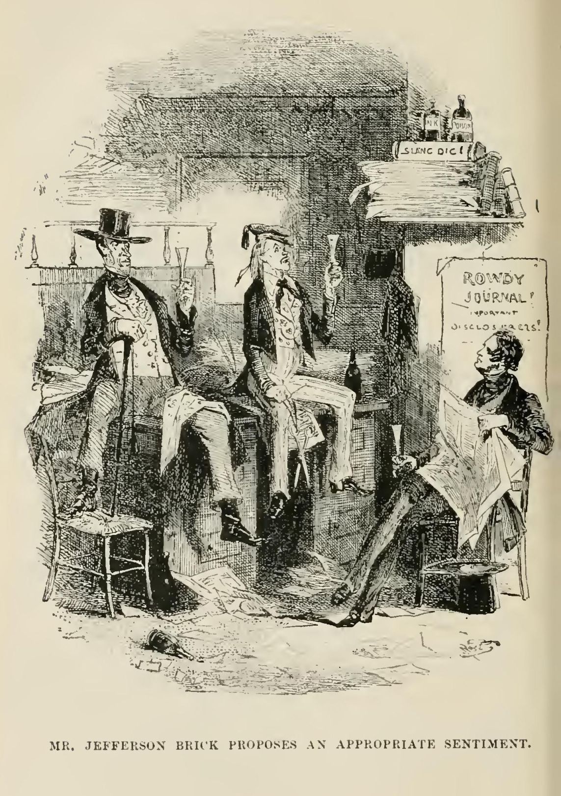 When this book was first published, I was given to understand, by some authorities, that the Watertoast Association and eloquence were beyond all bounds of belief. Therefore I record the fact that all that portion of Martin Chuzzlewit’s experiences is a literal paraphrase of some reports of public proceedings in the United States (especially of the proceedings of a certain Brandywine Association), which were printed in the Times Newspaper in June and July, 1843—at about the time when I was engaged in writing those parts of the book; and which remain on the file of the Times Newspaper, of course.