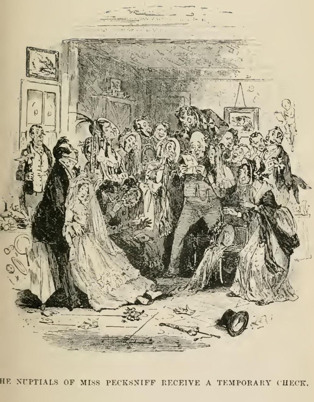 The door was thrown open at this juncture, and Miss Pecksniff entered, tottering, and supported by her three bridesmaids. The strong-minded woman brought up the rear; having waited outside until now, for the purpose of spoiling the effect.